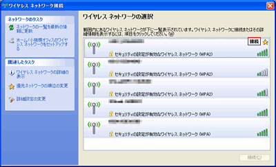 接続する無線LAN機器のSSIDをクリックし、[接続]をクリックます。